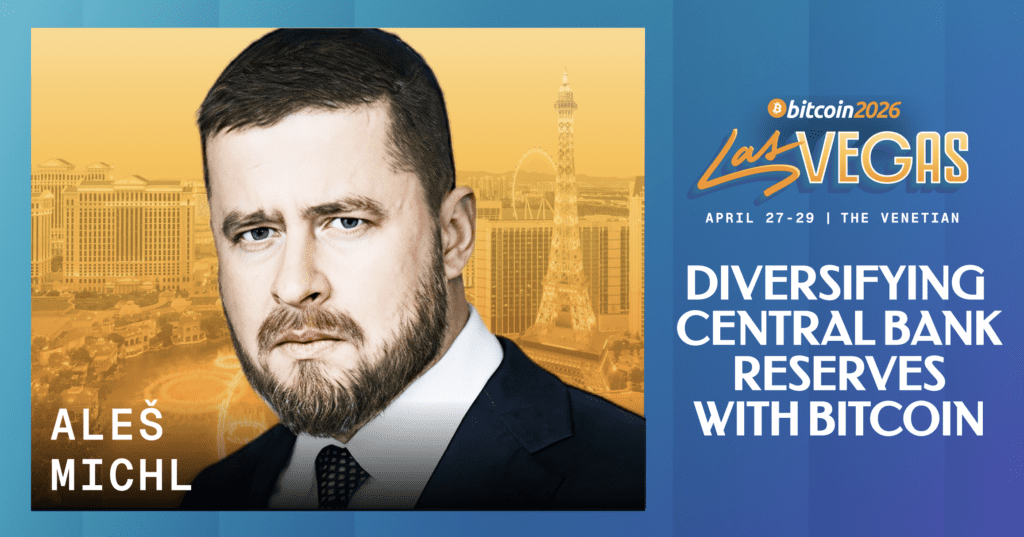 Aleš Michl has been officially confirmed as a speaker at Bitcoin 2026, where he will deliver a keynote titled “Diversifying Central Bank Reserves With Bitcoin” on April 28 at 10:20 AM PT on the Nakamoto Stage at The Venetian Resort in Las Vegas. Michl serves as Governor of the Czech National Bank (CNB) — and his presence at the event marks a significant moment as he becomes the first central bank governor to speak at The Bitcoin Conference.